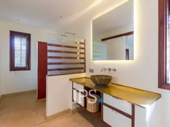 The villa features a spacious open-plan living area with abundant natural light, seamlessly connecting to the outdoor pool terrace and garden. The al fresco 8-seater dining area is perfect for entertaining guests or enjoying family meals in the tropical climate.